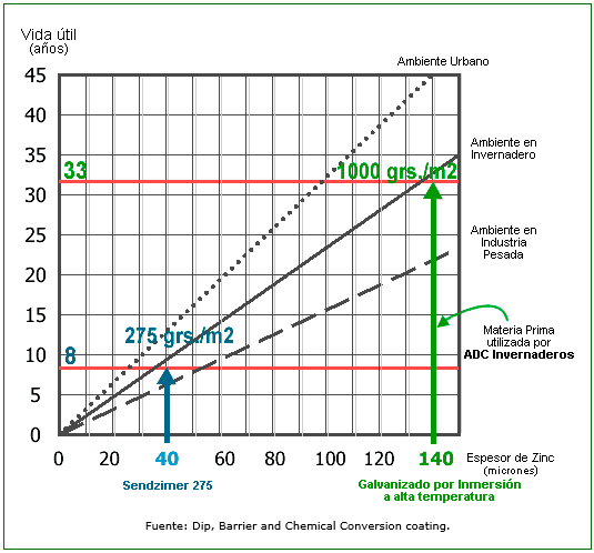 Es importante saber que la vida útil del material que conforma un invernadero está directamente relacionada con el espesor de la capa protectora de zinc que lo recubre (cuadro l).