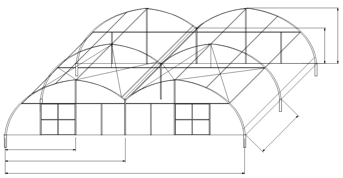 - Refuerzos internos cada 3 metros que sirven como soporte de malla de sombreo, mallas corredizas, riego por aspersión, sistema de iluminación, entutorado de plantas, mangas de calefacción etc.