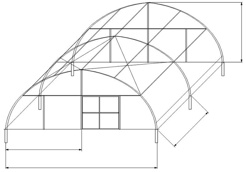 • Refuerzos internos cada 2 metros que sirven como soporte de malla de sombreo, mallas corredizas, riego por aspersión, sistema de iluminación, entutorado de plantas, macetas colgantes, mangas de calefacción, etc.